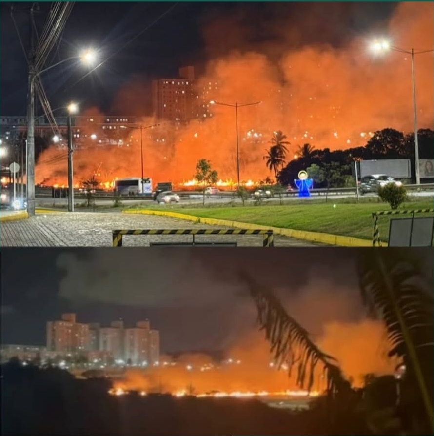 Um incêndio de grandes incidentes foi registrado na noite deste domingo (11), nas margens da BR-101, divisa entre Natal e Parnamirim. O fogo se espalhou na mata próximo à entrada da avenida que liga ao cemitério Morada da Paz, em Emaús. A imagem principal foi captada em frente ao condomínio residencial Buena Vista.