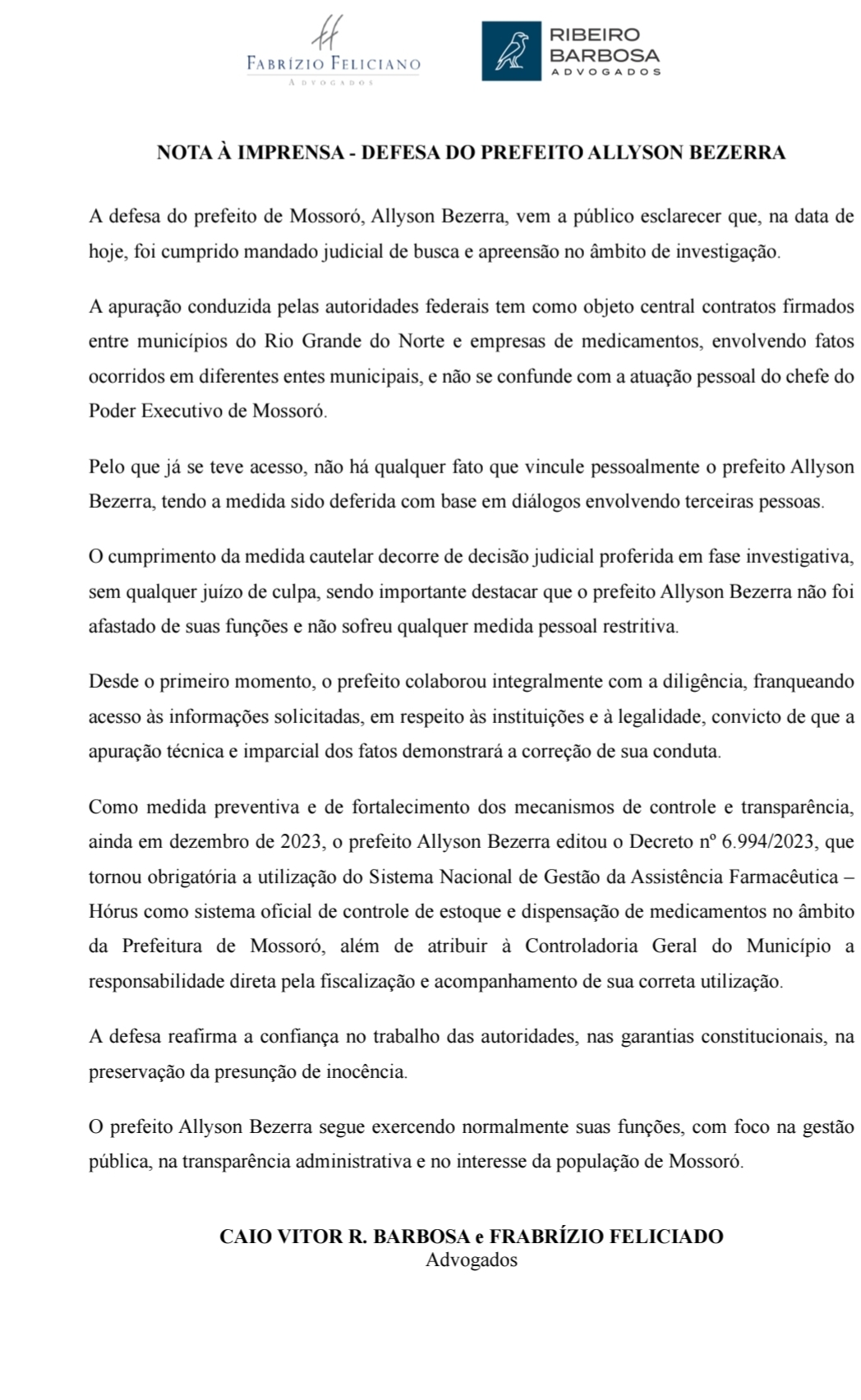 A defesa do prefeito de Mossoró, Allyson Bezerra, vem a público esclarecer que, na data de hoje, foi cumprido mandado judicial de busca e apreensão no âmbito de investigação. A apuração conduzida pelas autoridades federais tem como objeto central contratos firmados entre municípios do Rio Grande do Norte e empresas de medicamentos, envolvendo fatos ocorridos em diferentes entes municipais, e não se confunde com a atuação pessoal do chefe do Poder Executivo de Mossoró.Pelo que já se teve acesso, não há qualquer fato que vincule pessoalmente o prefeito Allyson Bezerra, tendo a medida sido deferida com base em diálogos envolvendo terceiras pessoas.