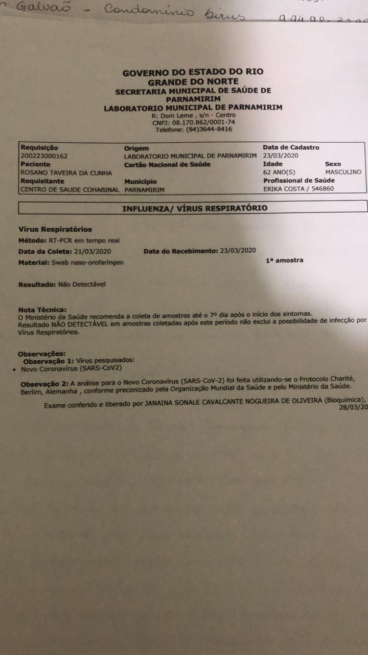 O prefeito Rosano Taveira realizou o teste para o coranavírus. O prefeito está no grupo de risco, é maior de 60 anos e no início deste mês, participou de reuniões políticas com várias lideranças. O teste negativo para o coronavírus foi apresentado neste dia 28/03/2020. Para o alívio do coronel e da sua família, está tudo sob controle. Agora, resta a ele cuidar da população parnamirinense que já registra 06 casos confirmados de covid-19.
