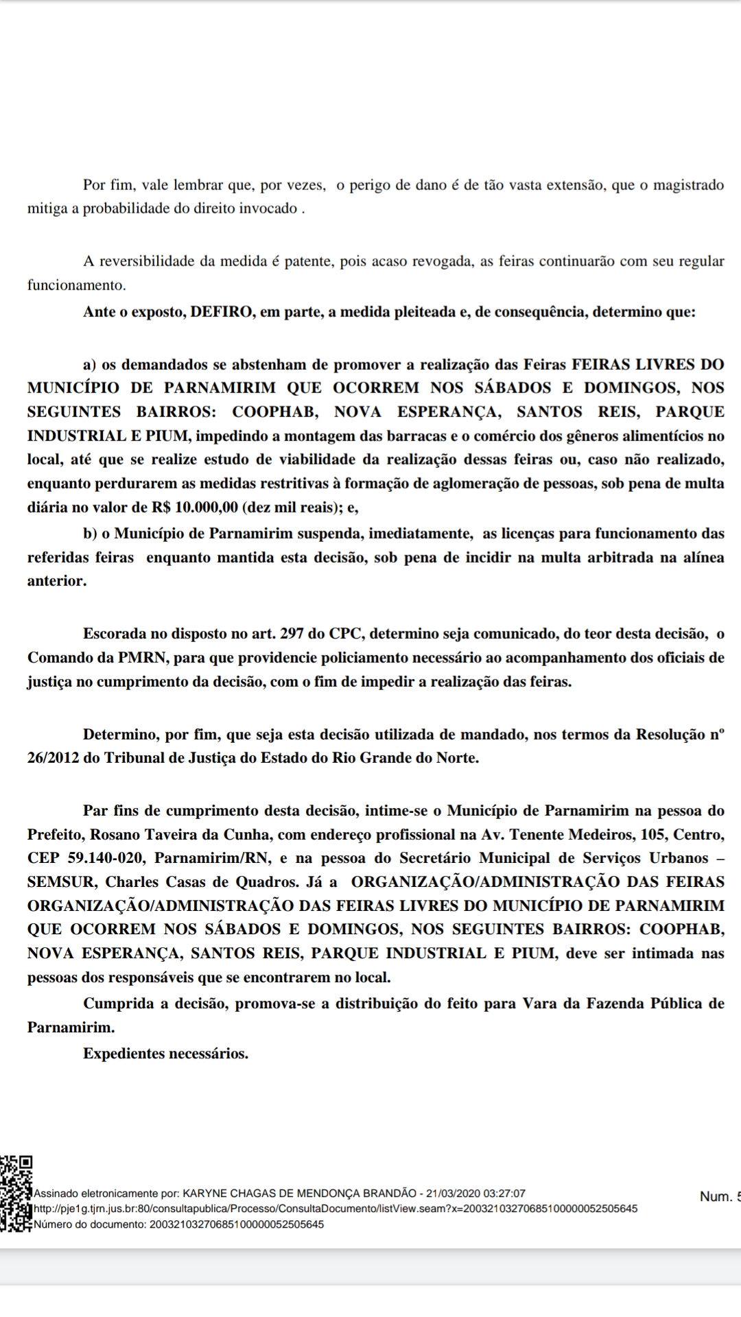 Determino, por fim, que seja esta decisão utilizada de mandado, nos termos da Resolução no 26/2012 do Tribunal de Justiça do Estado do Rio Grande do Norte. Par fins de cumprimento desta decisão, intime-se o Município de Parnamirim na pessoa do Prefeito, Rosano Taveira da Cunha, com endereço profissional na Av. Tenente Medeiros, 105, Centro, CEP 59.140-020, Parnamirim/RN, e na pessoa do Secretário Municipal de Serviços Urbanos – SEMSUR, Charles Casas de Quadros. Já a ORGANIZAÇÃO/ADMINISTRAÇÃO DAS FEIRAS ORGANIZAÇÃO/ADMINISTRAÇÃO DAS FEIRAS LIVRES DO MUNICÍPIO DE PARNAMIRIM QUE OCORREM NOS SÁBADOS E DOMINGOS, NOS SEGUINTES BAIRROS: COOPHAB, NOVA ESPERANÇA, SANTOS REIS, PARQUE INDUSTRIAL E PIUM, deve ser intimada nas pessoas dos responsáveis que se encontrarem no local.
