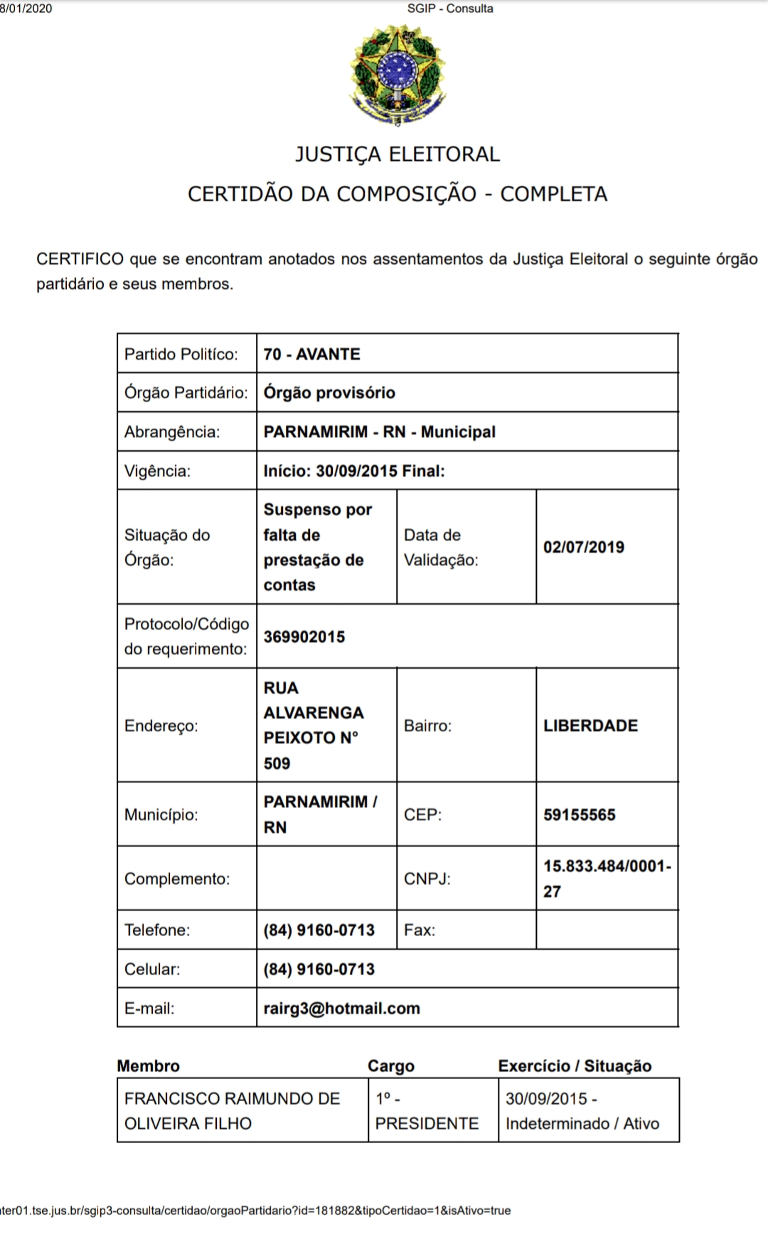 O Presidente do Partido ainda é o advogado Francisco Raimundo, gente da cozinha dos PAIVAS, e, de acordo com essa certidão atualizada do TSE, a carimbada final não será dada por ninguém da prefeitura e sim pelo tabelião Airene. E agora Afrânio? Como diz o dito popular, os incomodados que se retirem. O Pré-Candidato a Vereador Afrânio terá que decidir se não quiser ser liderado por Airene ou Carlos Maia, precisará seguir AVANTE em busca de um novo partido.