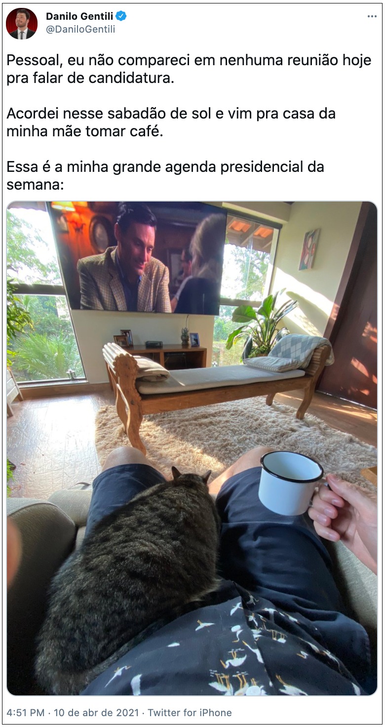 “Pessoal, eu não compareci em nenhuma reunião hoje pra falar de candidatura. Acordei nesse sabadão de sol e vim pra casa da minha mãe tomar café”, escreveu Gentili em seu perfil no Twitter.