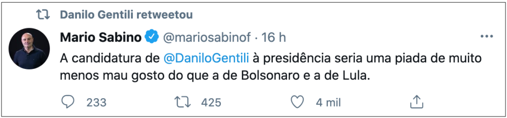 “A candidatura de Danilo Gentili à presidência seria uma piada de muito menos mau gosto do que a de Bolsonaro e a de Lula”, escreveu Sabino.