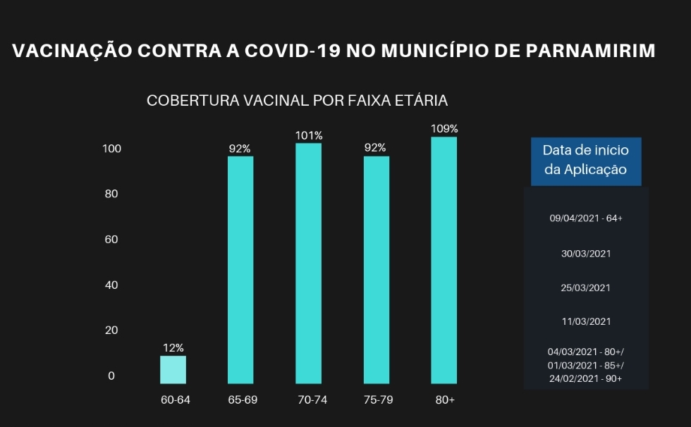 Quanto às doses aplicadas nas faixas etárias prioritárias, o município de Parnamirim já vacinou mais de 100% dos idosos com mais de 80 anos e os com faixa etária de 70 a 74 anos, e 92% dos idosos com idade entre 75 e 79 anos e 65 e 69 anos, como é possível conferir no quadro abaixo:
