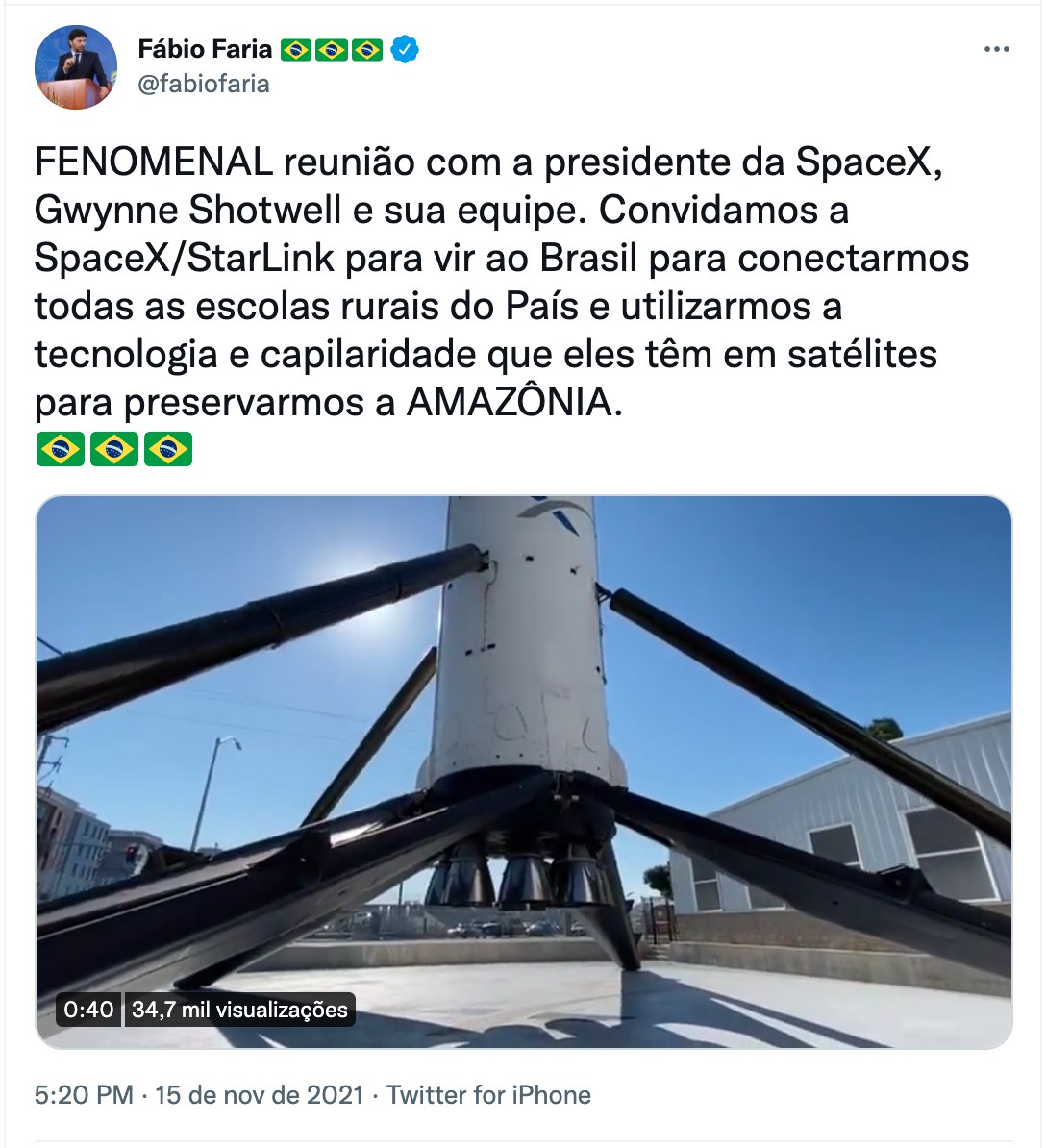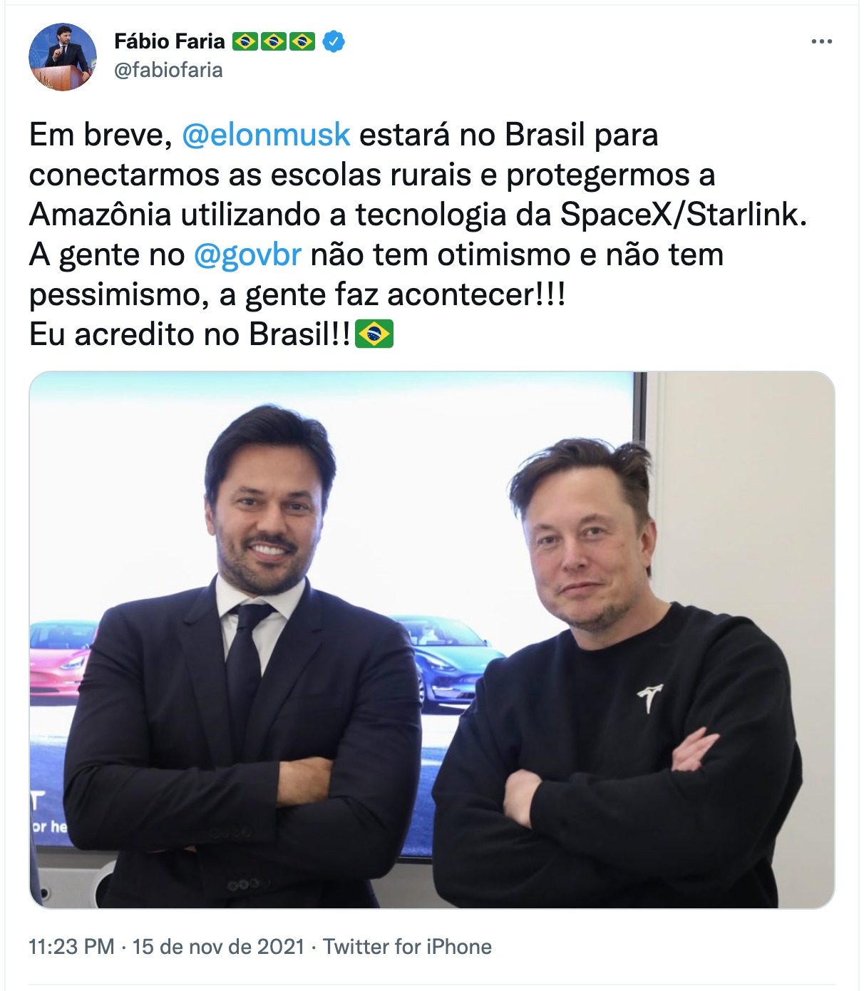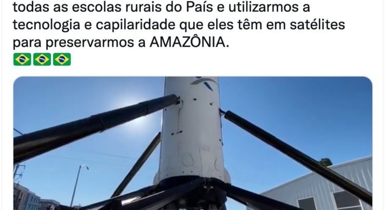 Segundo Faria, a parceria com a tecnologia das empresas de Elon Musk será para conectar regiões remotas do Brasil e “ampliar a conectividade e proteção da Amazônia”. “Em breve, Elon Musk estará no Brasil para conectarmos as escolas rurais e protegermos a Amazônia utilizando a tecnologia da SpaceX/Starlink!”, disse Faria.
