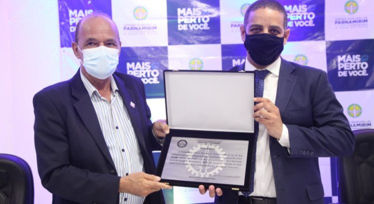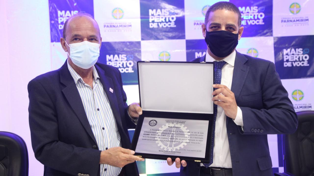 O Prefeito Rosano Taveira foi homenageado com uma Moção de Aplauso durante sessão solene, realizada durante a 59º Festa do Boi, no auditório da ANORC, localizado no Parque Aristófanes Fernandes. A Moção é de autoria do vereador e presidente da Câmara Municipal, Wolney França e foi conferida em função da parceria da Prefeitura com a Casa Legislativa para a realização do evento.