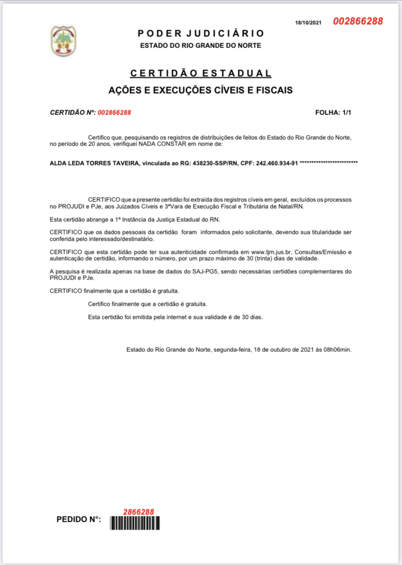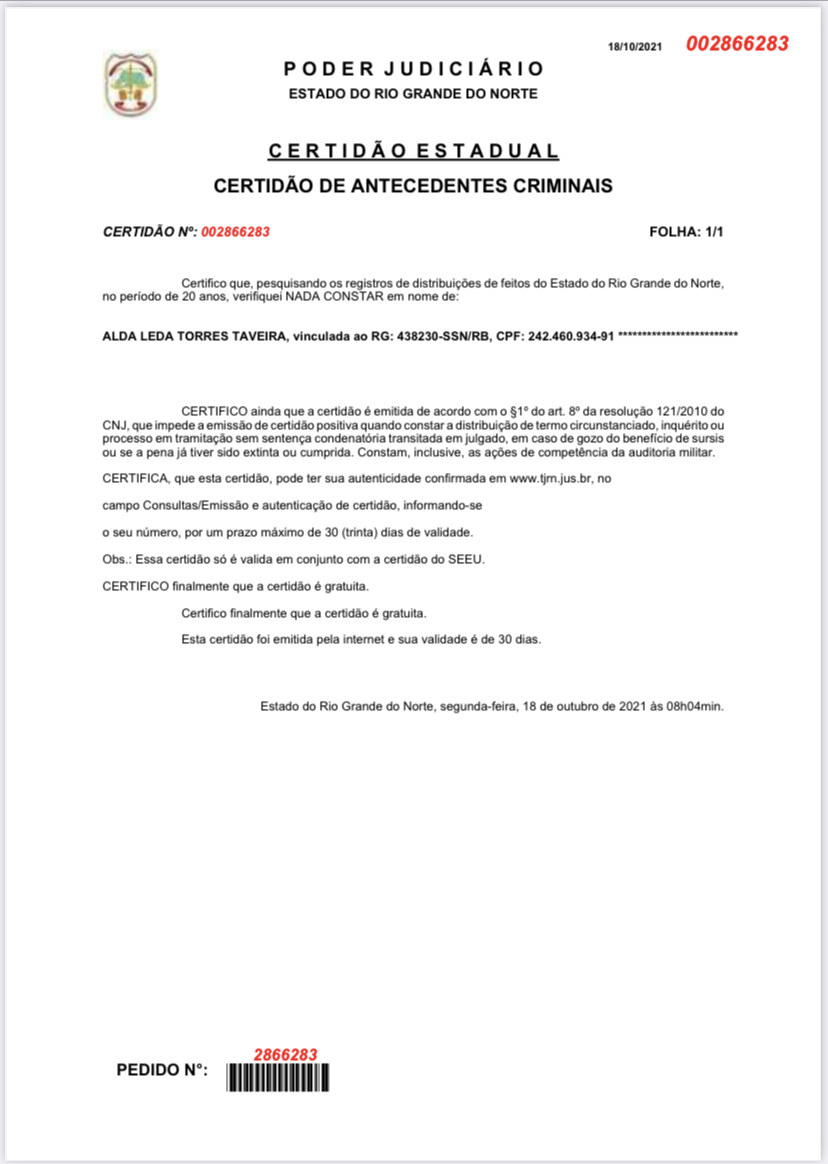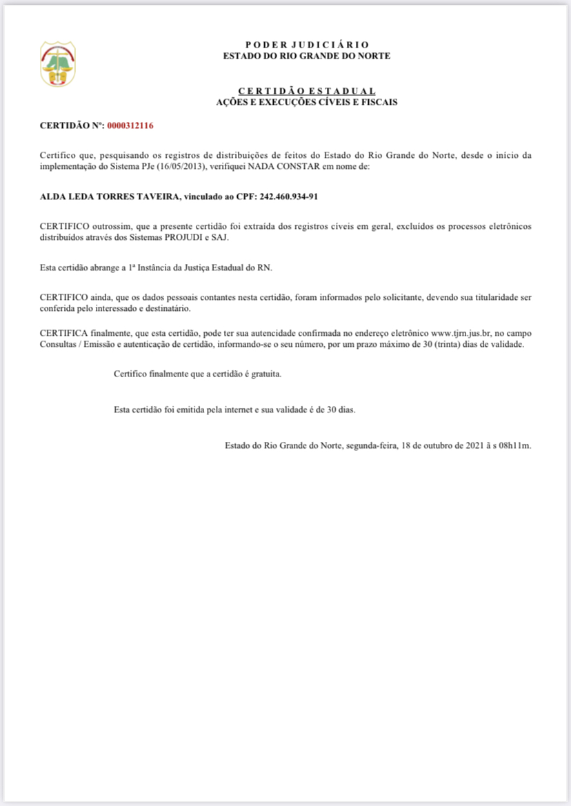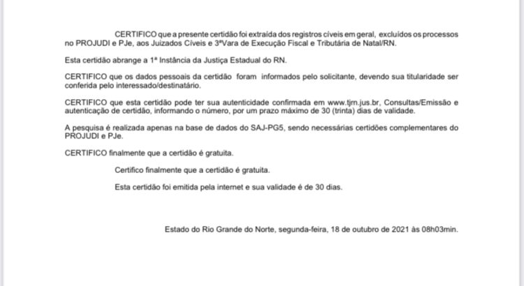 Mas como diz o ditado popular: “a mentira tem pernas curtas”, assim, no momento certo, a verdade é apresentada. Segue certidão com o nada consta, desta segunda-feira, 18 de outubro de 2021, às 08h11m. A primeira dama é uma das 20 pessoas, investigadas na operação fura fila, mas até agora, não foi denunciada por nenhum crime.