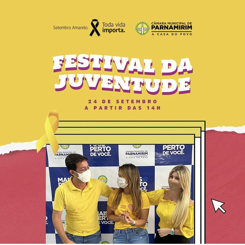 A Câmara Municipal de Parnamirim promove o Festival da Juventude, uma série de atividades voltadas para os jovens da cidade, dentro da campanha Setembro Amarelo – mês de combate e conscientização sobre a prevenção ao suicídio. O evento acontece nesta sexta-feira (24), a partir das 14h, na sede da Casa Legislativa.