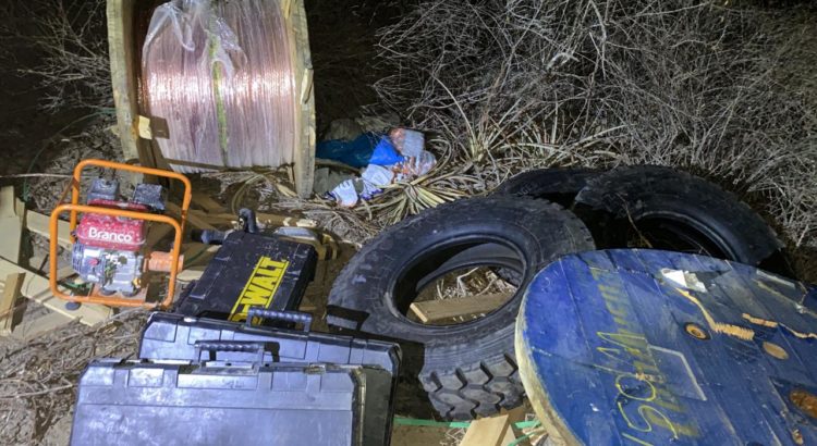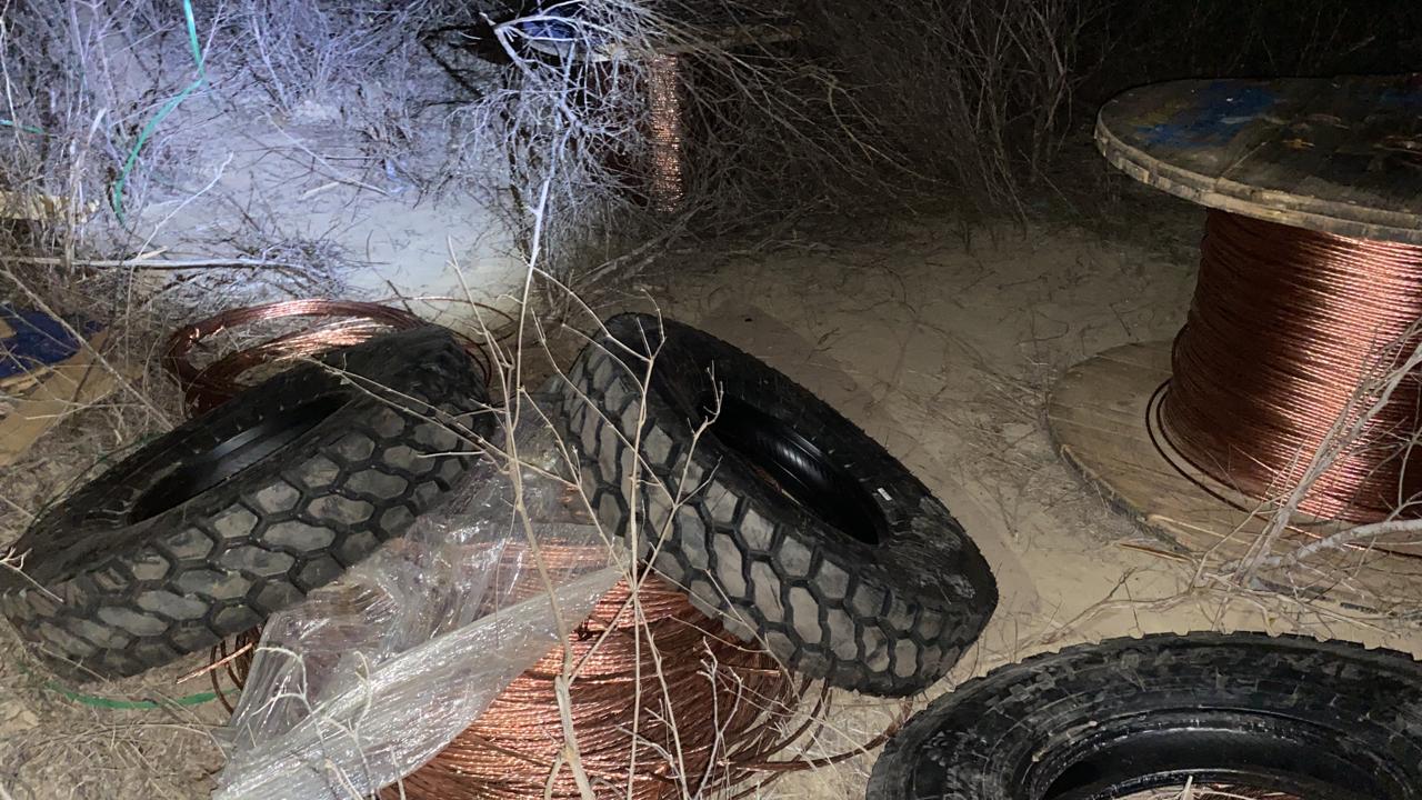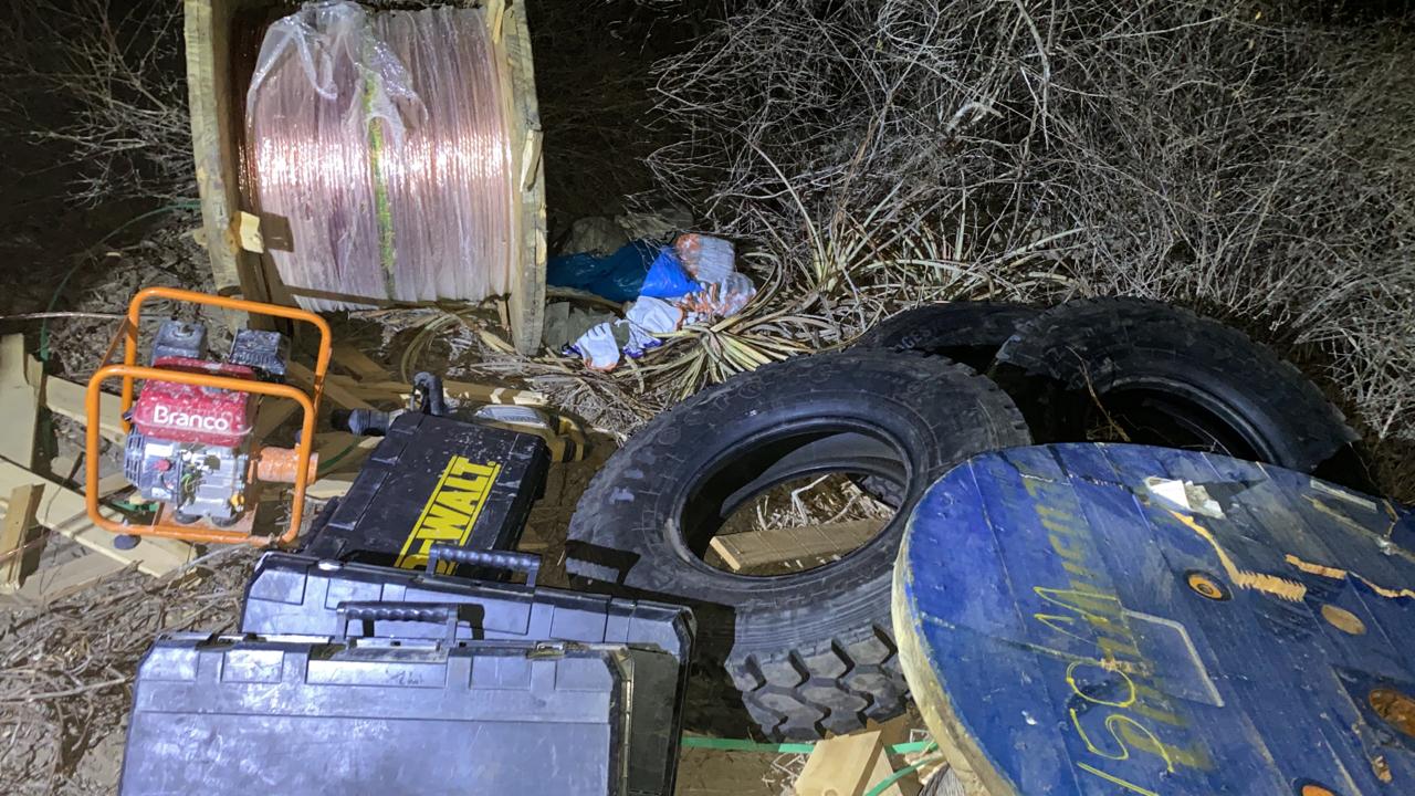 Durante as diligências, foram recuperados: 34 pneus novos de caminhão, 19 bobinas de fio de cobre, sendo 17 lacradas e duas já violadas, pedaços de fio de cobre (cortados), uma motobomba, quatro marteletes profissionais grandes, vários pacotes de luvas de couro e diversos metros de fio encapado.