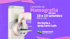 Buscando ampliar e facilitar o acesso do público-alvo para o serviço de mamografia disponibilizado através da unidade móvel, a Prefeitura de Parnamirim estará com o caminhão na Capela Santa Luzia em Pium (próximo à pracinha), nos dias 18 e 19 de setembro, das 8h às 16h.