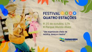 Com o objetivo de reunir expressões artísticas que valorizam o talento local e fortalecem a identidade cultural da nossa cidade, a Prefeitura de Parnamirim, por meio da Secretaria Municipal de Cultura (Semuc), realiza no próximo sábado, 25, o primeiro Festival de Cultura “Quatro Estações”, com apresentações dos alunos das oficinas de dança, teatro e música da Semuc.