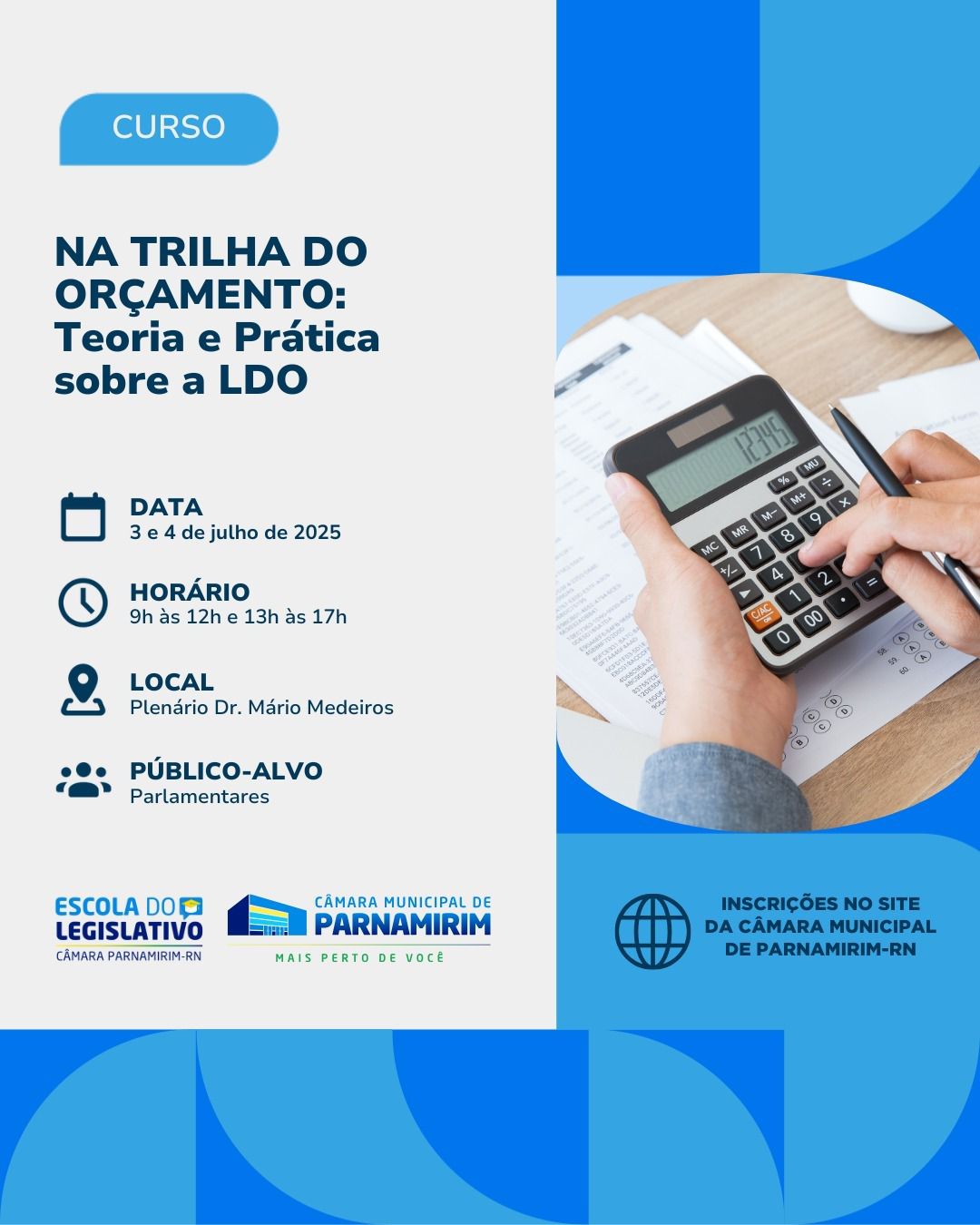 A Escola do Legislativo de Parnamirim promove, nesta quinta e sexta-feira (3 e 4), o curso “Na trilha do orçamento público: teoria e prática sobre a Lei de Diretrizes Orçamentárias (LDO)”. As aulas acontecerão das 9h às 12h e de 13h às 17h, no Plenário Dr. Mário Medeiros.