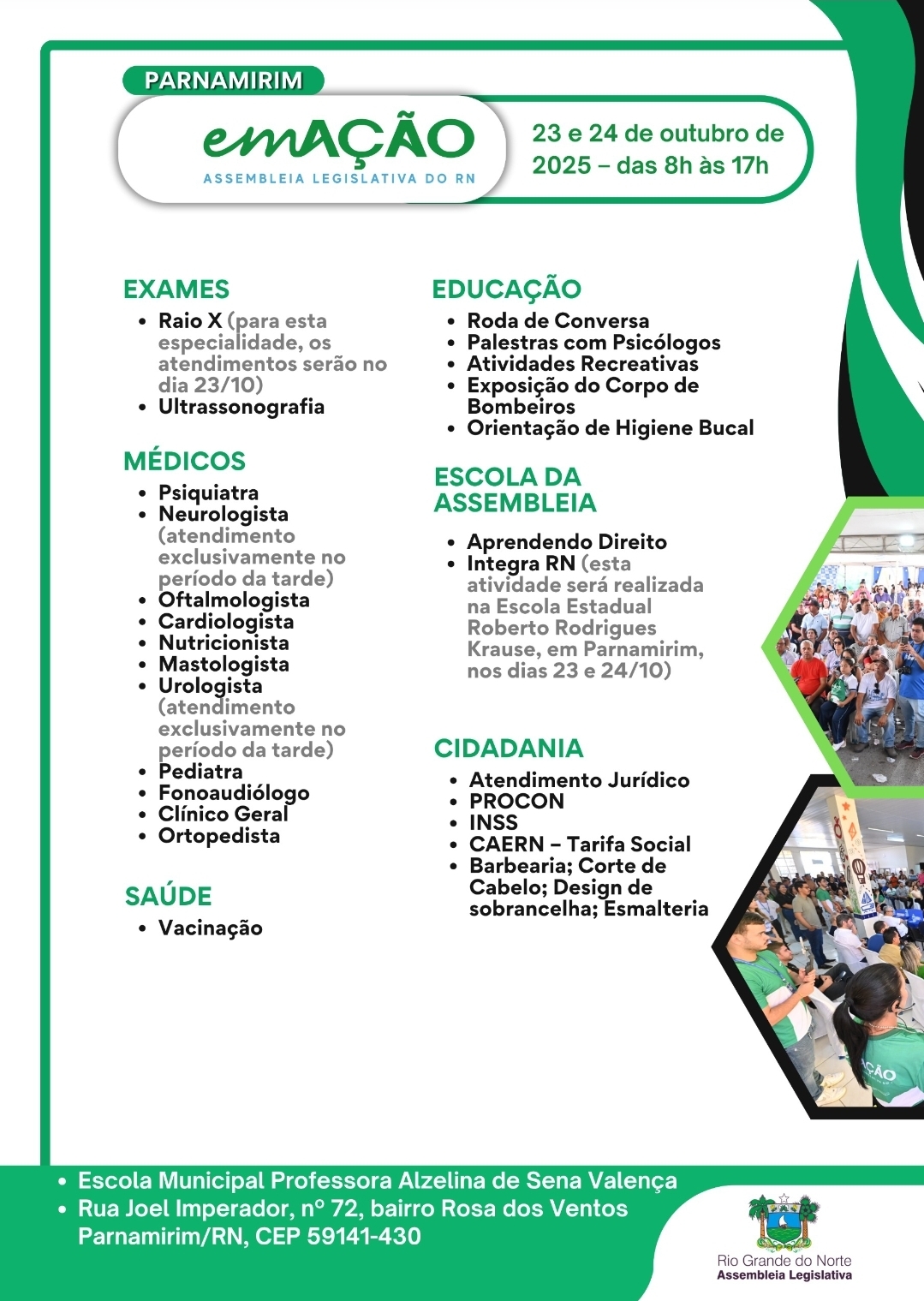 Parnamirim será contemplada pelo programa em Ação promovido pela Assembleia Legislativa do Rio Grande do Norte (ALRN). A ação acontece nos dias 23 e 24 de outubro, das 8h às 17h, na Escola Municipal Professora Alzelina de Sena Valença, localizada na Rua Joel Imperador, no bairro Rosa dos Ventos.