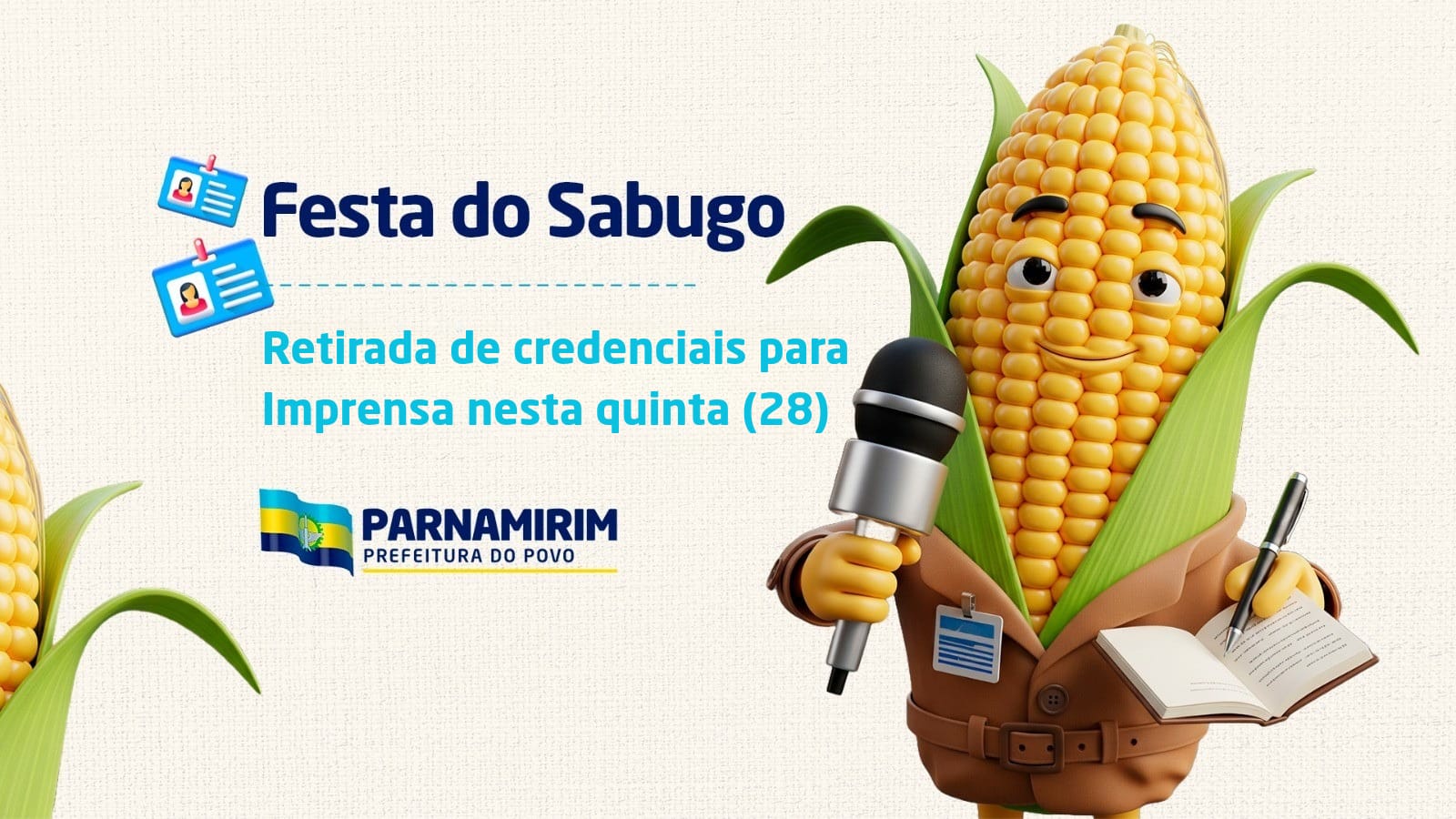 A Prefeitura de Parnamirim inicia, nesta quinta-feira (28), às 14h, a entrega dos crachás para os jornalistas credenciados para tradicional Festa do Sabugo. A retirada acontecerá até sexta-feira (29), às 15h.