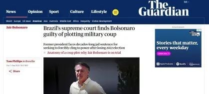 O jornal The Guardian, do Reino Unido, destacou que o ex-presidente pode pegar pena de “décadas de prisão” por “tentar se agarrar ao poder à força após perder a eleição de 2022”.
