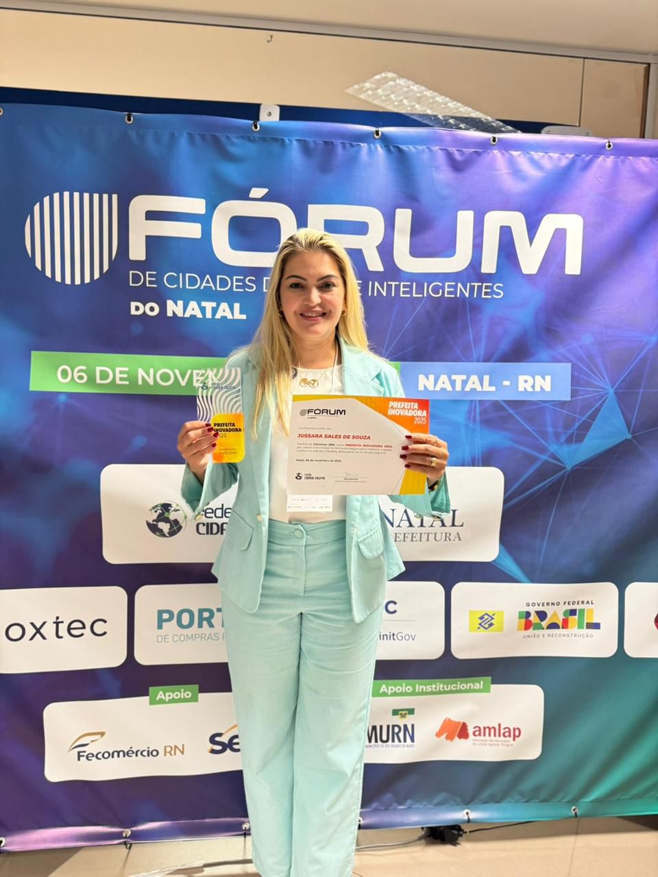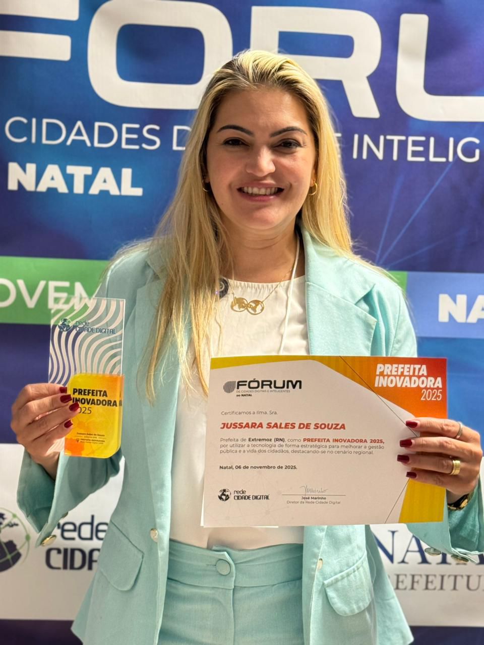 Durante o encontro, Jussara Sales recebeu o Prêmio Prefeita Inovadora 2025, concedido pela Rede Cidade Digital, em reconhecimento às ações que vêm transformando Extremoz em uma cidade mais moderna, conectada e sustentável. O município é o primeiro do Rio Grande do Norte 100% iluminado por lâmpadas de LED, além de investir em projetos que unem tecnologia e cidadania.