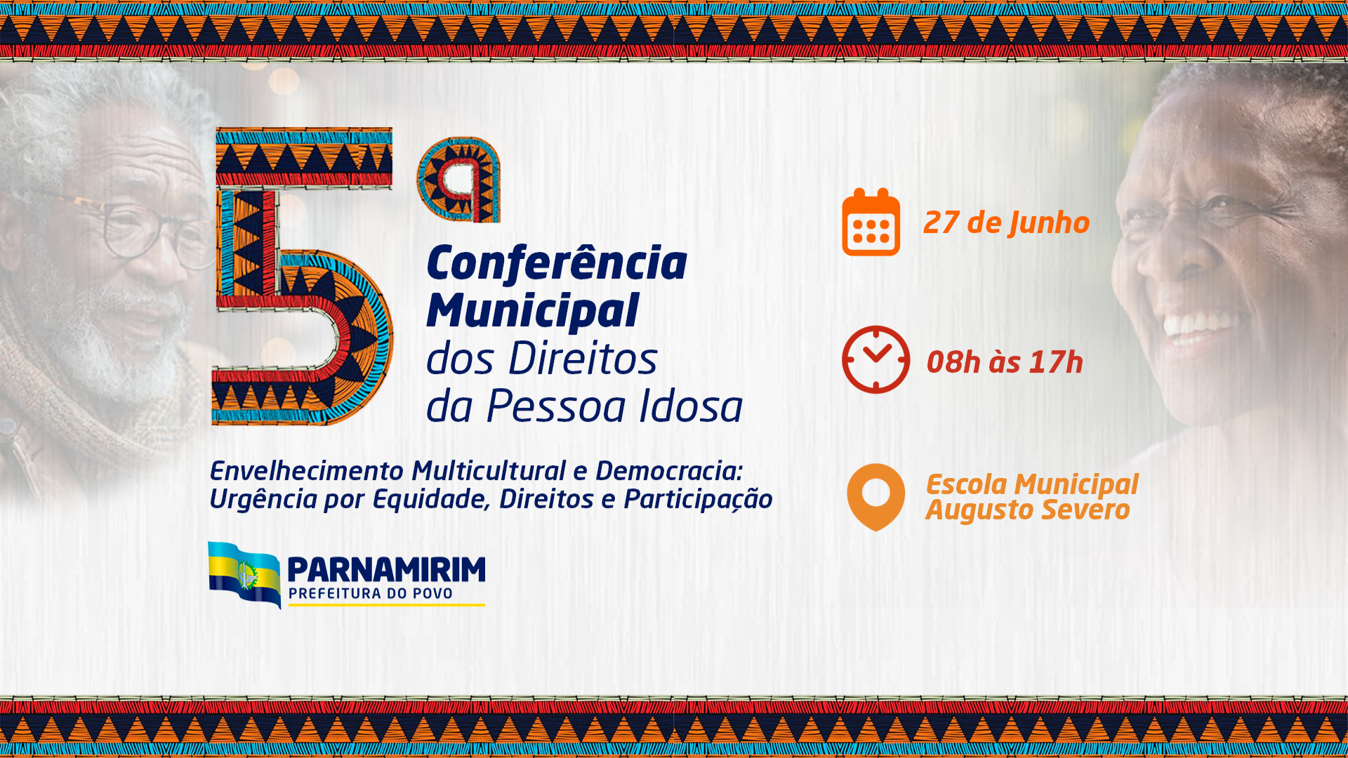 A Prefeitura de Parnamirim, através da Secretaria Municipal de Assistência Social (SEMAS) e do Conselho Municipal dos Direitos da Pessoa Idosa (CMDPI), realizará na próxima sexta-feira (27) a 5ª Conferência Municipal dos Direitos da Pessoa Idosa, que acontecerá das 8h às 17h no Auditório da Escola Municipal Augusto Severo.