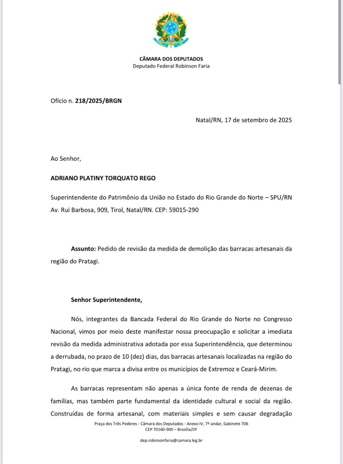 A Prefeitura de Extremoz reforçou o apelo em defesa dos trabalhadores do Rio Pratagí e recebeu apoio da bancada federal potiguar contra a ordem de demolição das barracas artesanais instaladas na região, determinada pela União. O coordenador da bancada, deputado Robinson Faria (PP), encaminhou ofício à Superintendência do Patrimônio da União (SPU/RN) solicitando a suspensão imediata da medida e a abertura de diálogo institucional para buscar alternativas.
