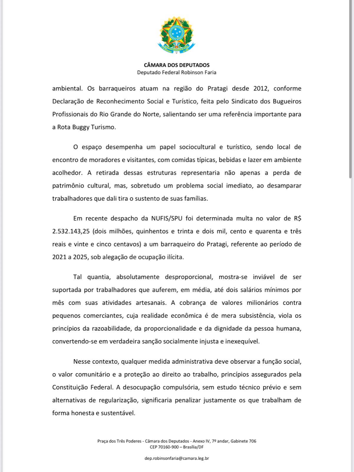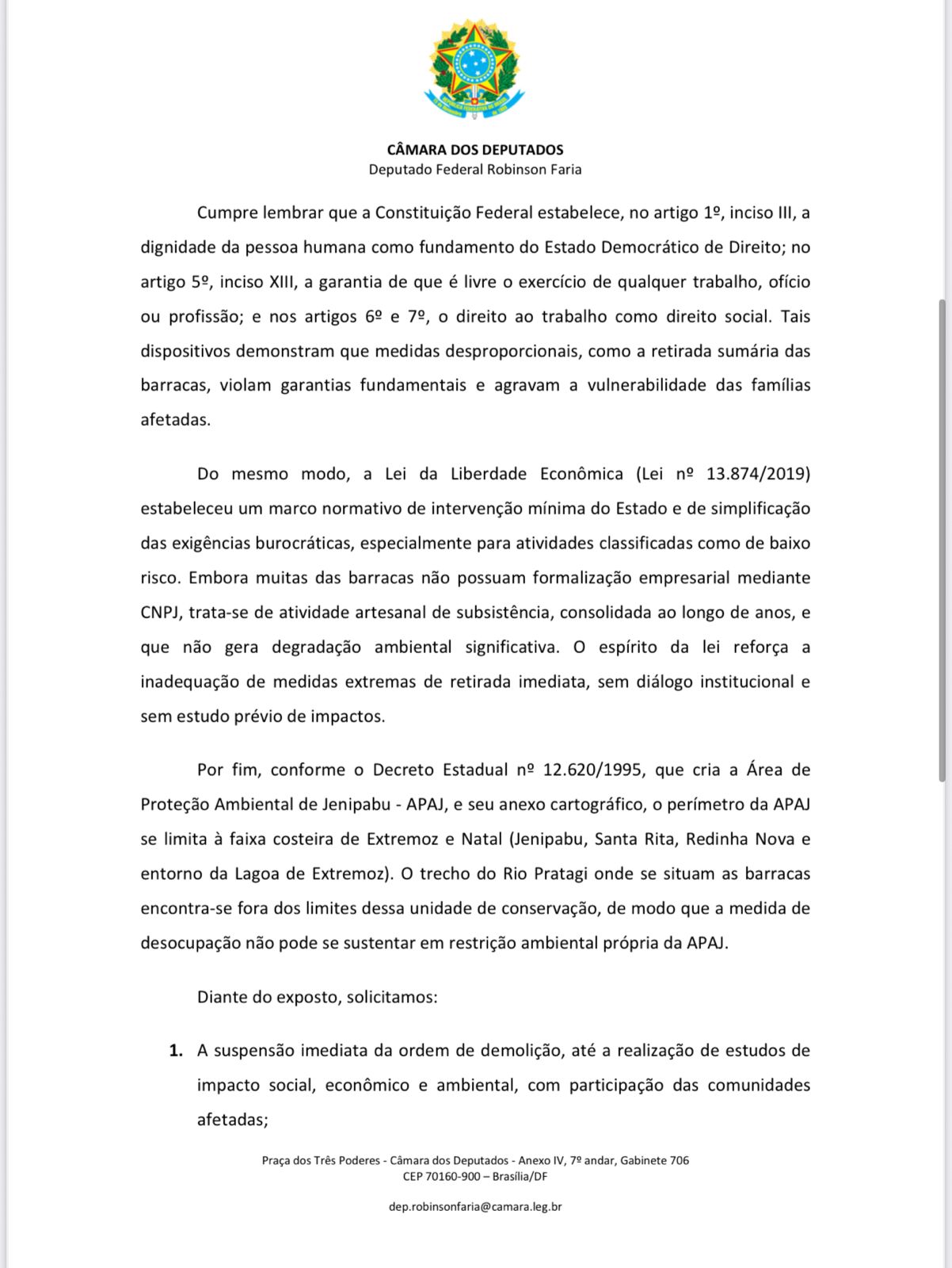 No ofício, a bancada federal ressalta que a retirada sumária das estruturas ameaça a sobrevivência de dezenas de famílias, além de ignorar o valor cultural, social e econômico das barracas para a região. O texto também pede a prorrogação de prazos e a construção de soluções conciliatórias que preservem tanto o meio ambiente quanto os direitos dos trabalhadores.