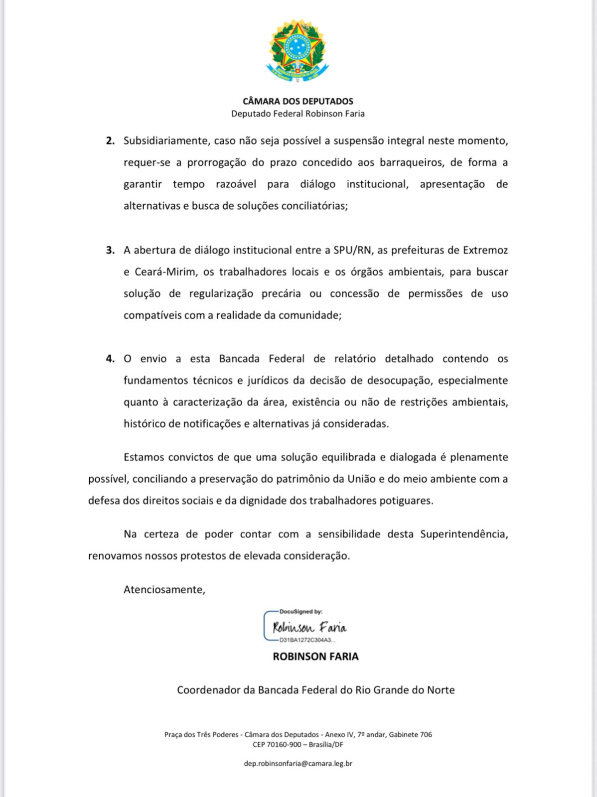 O documento contou com a assinatura de todos os parlamentares do Rio Grande do Norte (senadores e deputados) com exceção da deputada Natália Bonavides (PT), que não subscreveu o pedido.